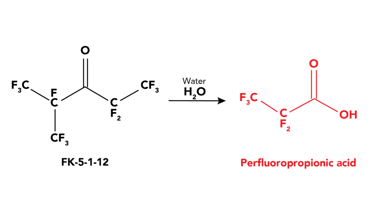 FK-5-1-12 is a fluorinated ketone that chemically reacts with water and forms perfluoropropionic acid, as shown below.